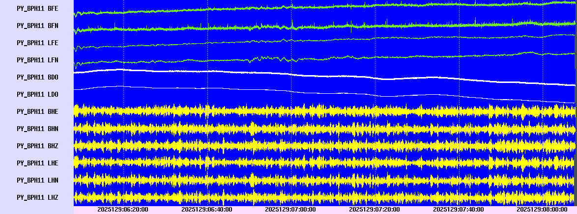 The image below is a snapshot of the last 2 hours of data the network has received from requested stations. The page is auto-refreshed every 150 seconds to reflect the latest data recorded. Waveform data is yellow, orange, green or white with a dark blue background. A light blue or black background represents zero data. The most recent data is on the right-hand side, with the edge of the right-hand side of the image being the current time. Time is shown at the bottom of the image in the format YYYYJJJ:hh:mm:ss, where YYYY is the year, JJJ is the Julian Date, hh is the hour (24 hour), mm is the minute, and ss is the second.